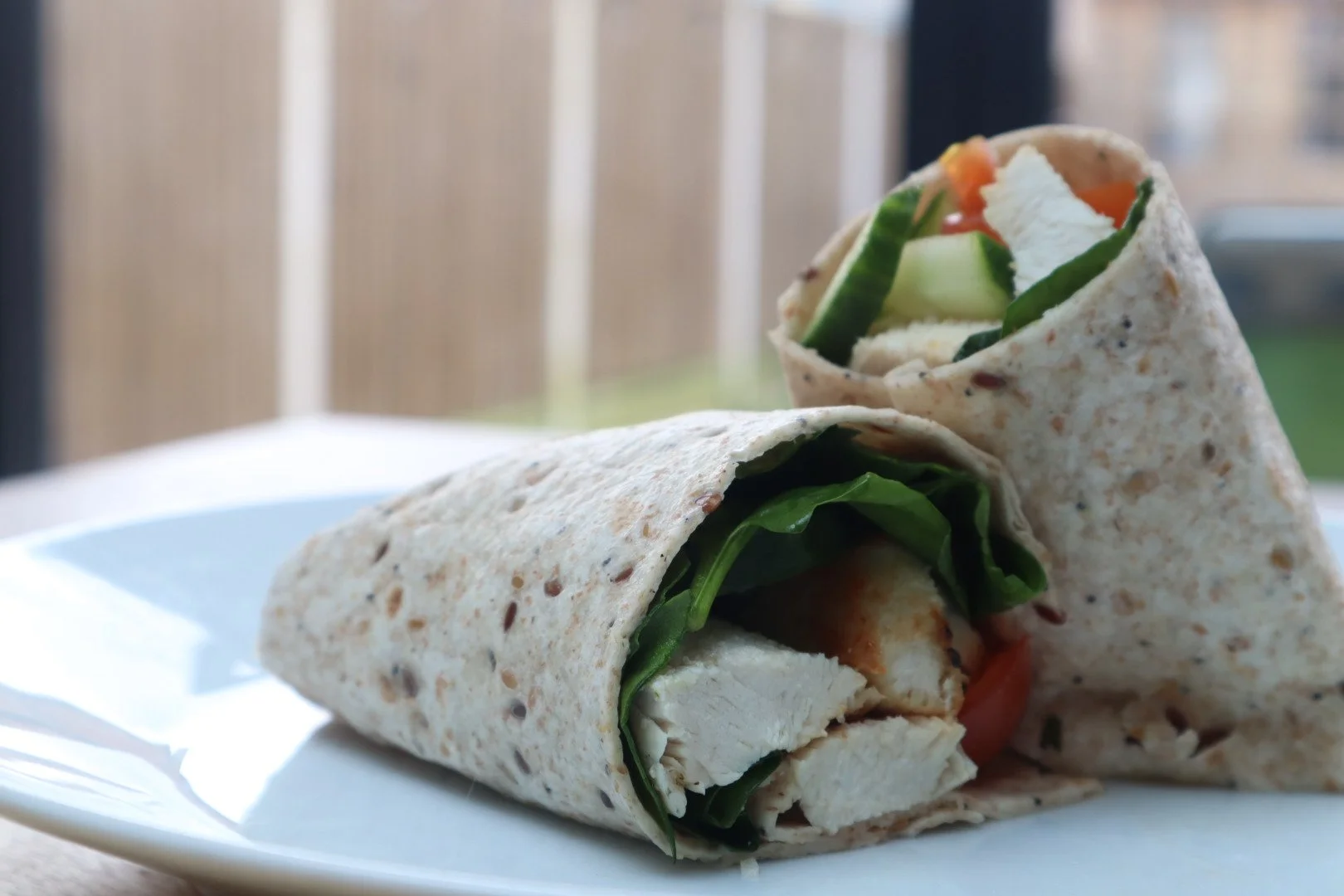 Either serve or place in air fryer/oven for 5 minutes to crisp the wrap and serve.